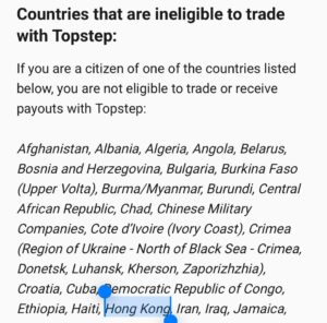 因應美國財政部海外資產控制辦公室(OFAC)相關規定,香港已被Topstep列為禁止使用地區。除了香港,北韓、俄羅斯、越南等國家居民都不可以使用Topstep。